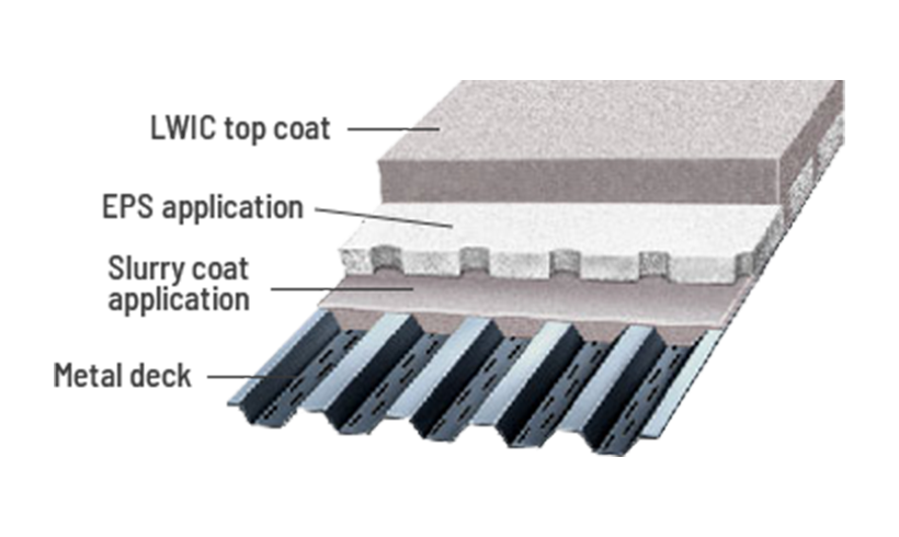 MEARLCRETE™ can be applied over non-vented substrates including existing roof membranes, galvanized vented or non-vented steel deck, precast concrete, or cast-in-place structural concrete. MEARLCRETE™ Lightweight Insulating Concrete (LWIC) placed over a metal deck can be used to enhance the shear diaphragm providing additional resistance to shear forces resulting from wind or seismic activity.